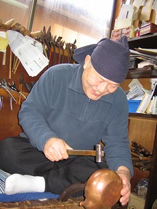 当金にかけ鎚を用い打出し中