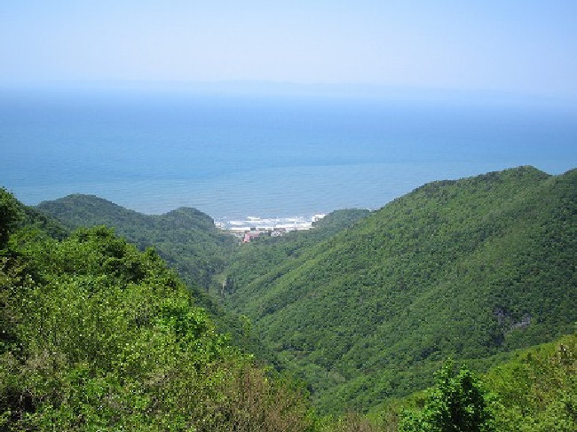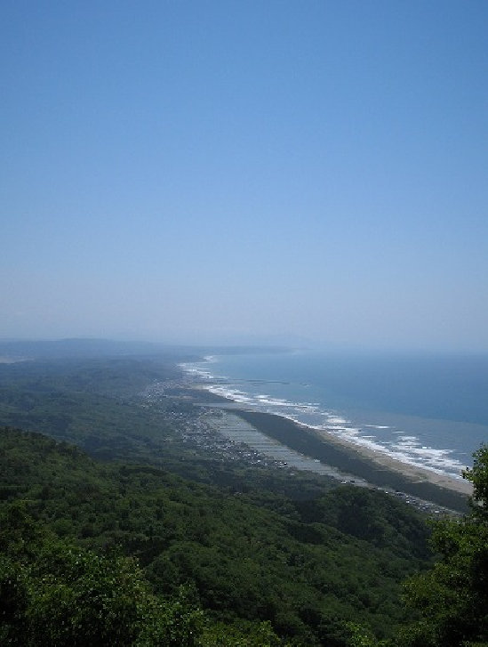 西を望むと眼下に、田ノ浦浜30キロ後方には佐渡