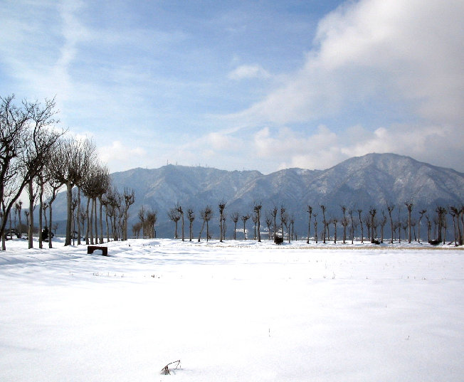 早春の、弥彦山 (左) と 多宝山 (右)